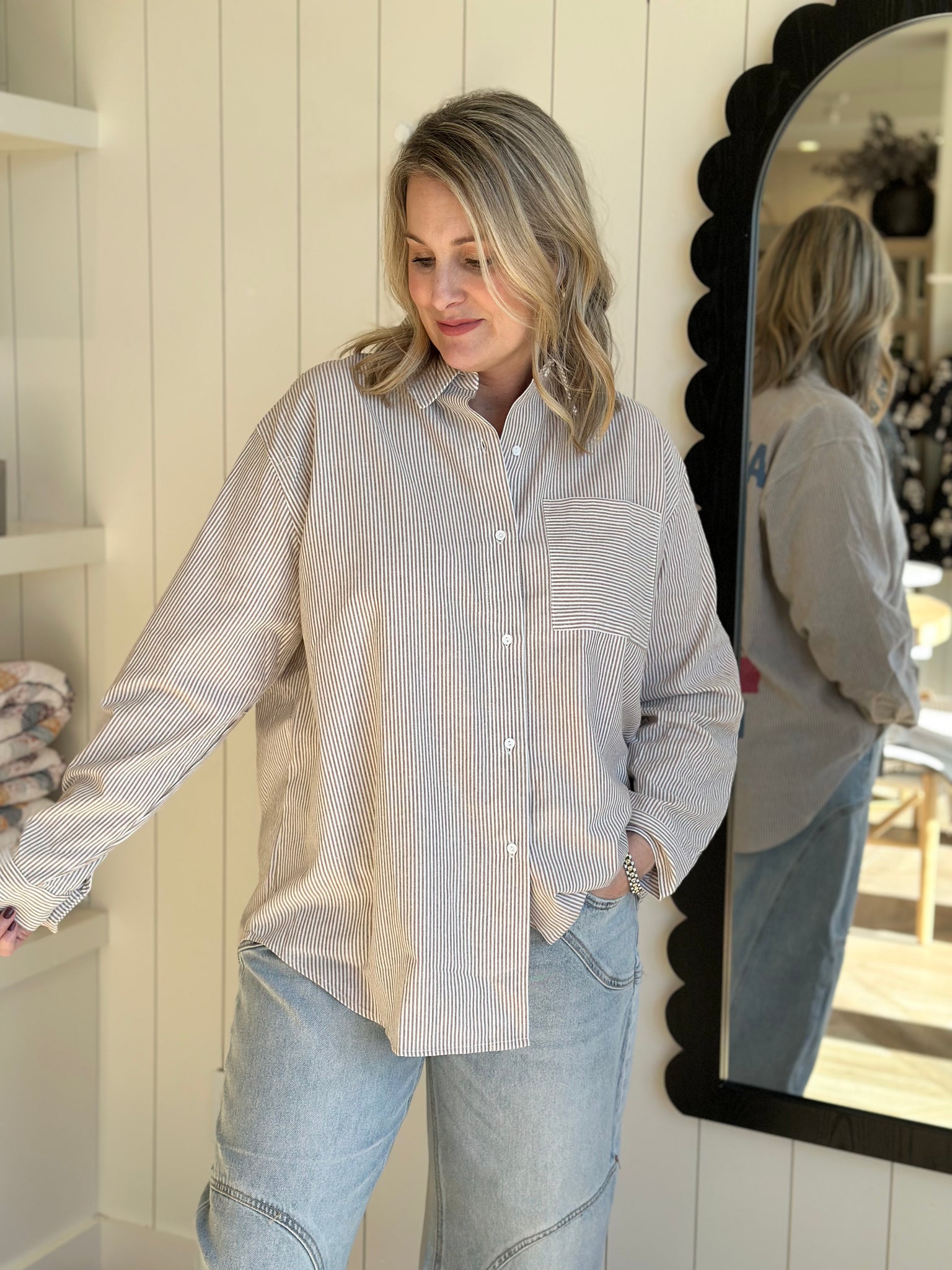 American Lobster Tan and White Pinstriped long sleeve button down shirt