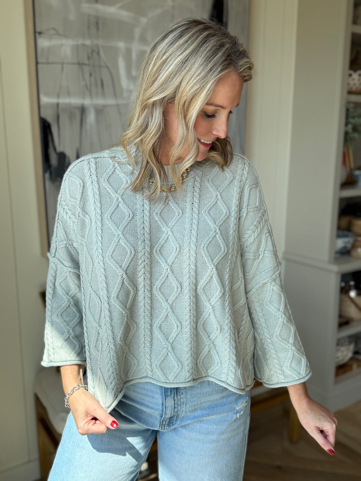 Aqua Grey Lioness Cable Knit Boxy Sweater with 3/4 Sleeves. Cotton