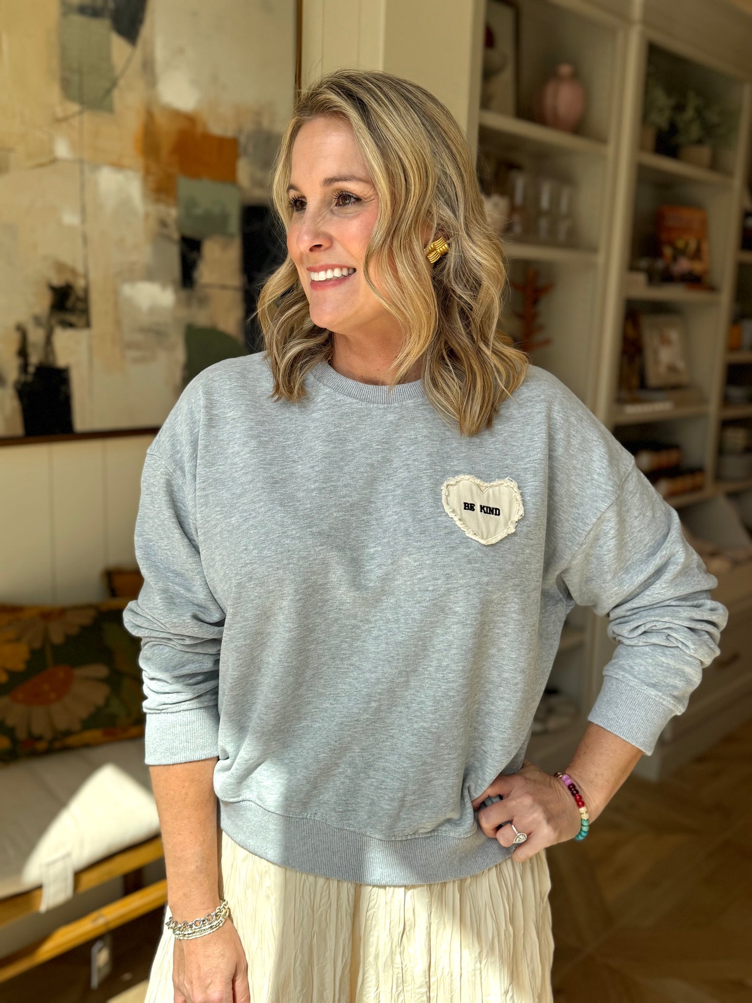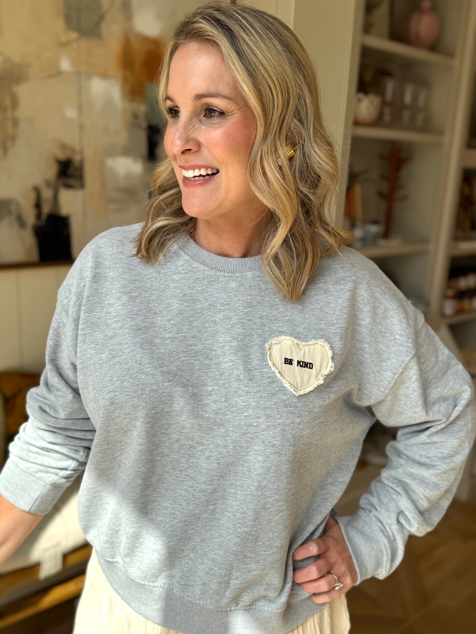 Be Kind Patch on Grey French Terry Sweatshirt. Cotton