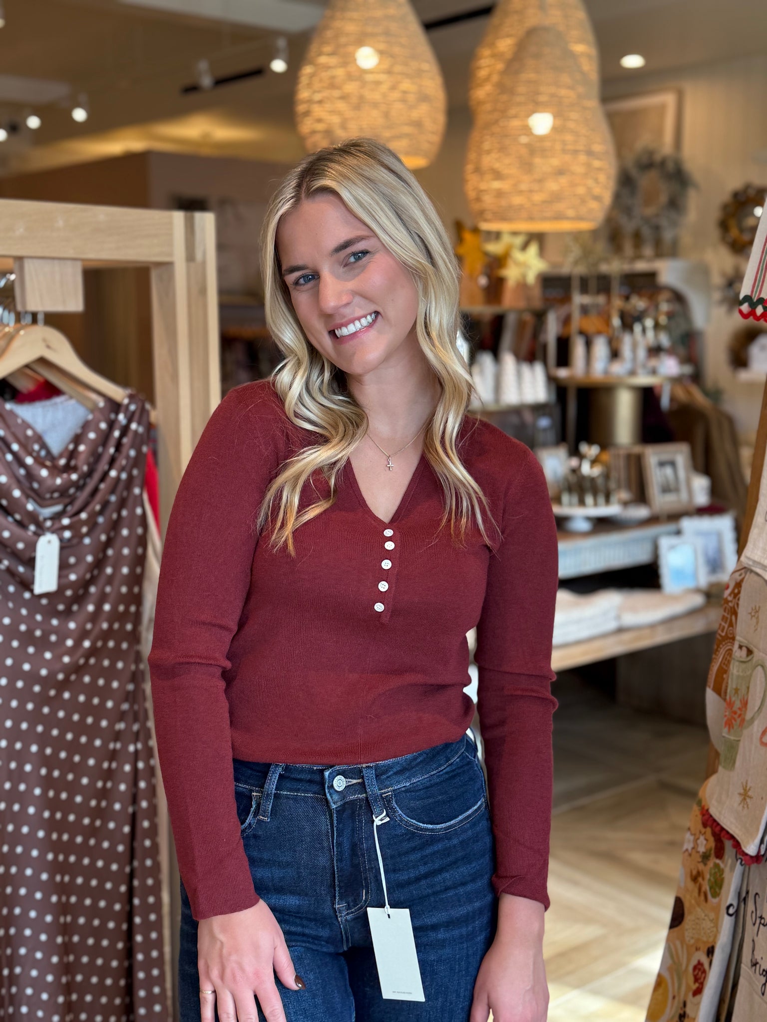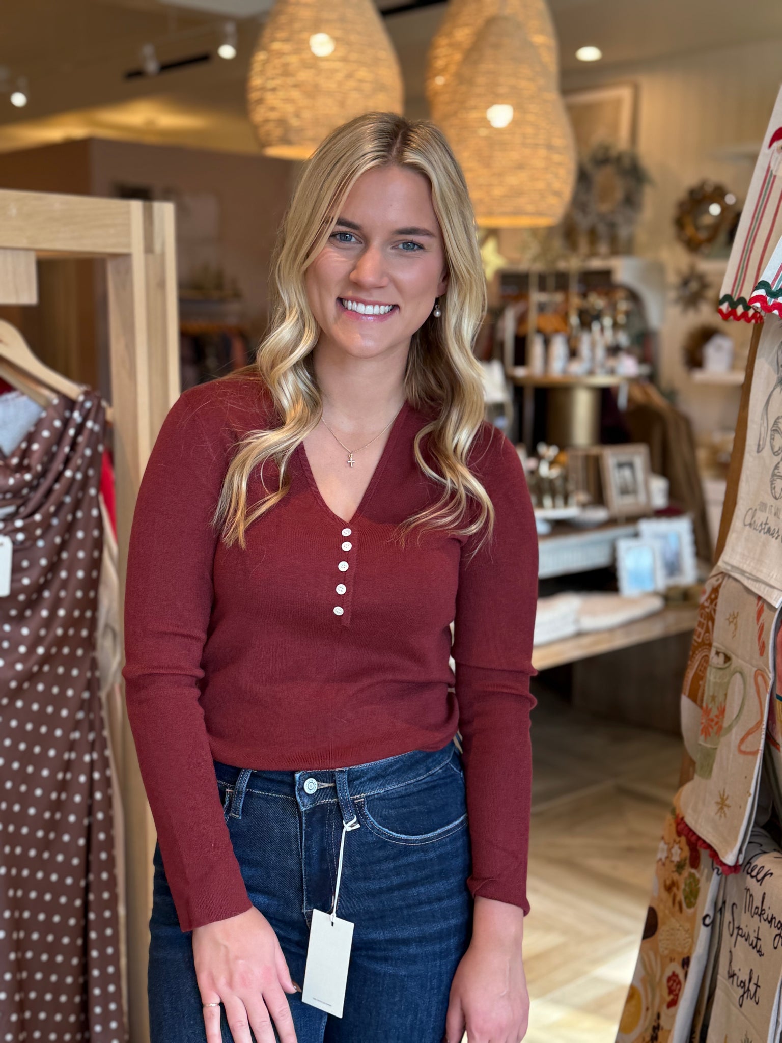 Brick v-Neck Henley Sweater Top. Poly/Acrylic/Nylon/Wool