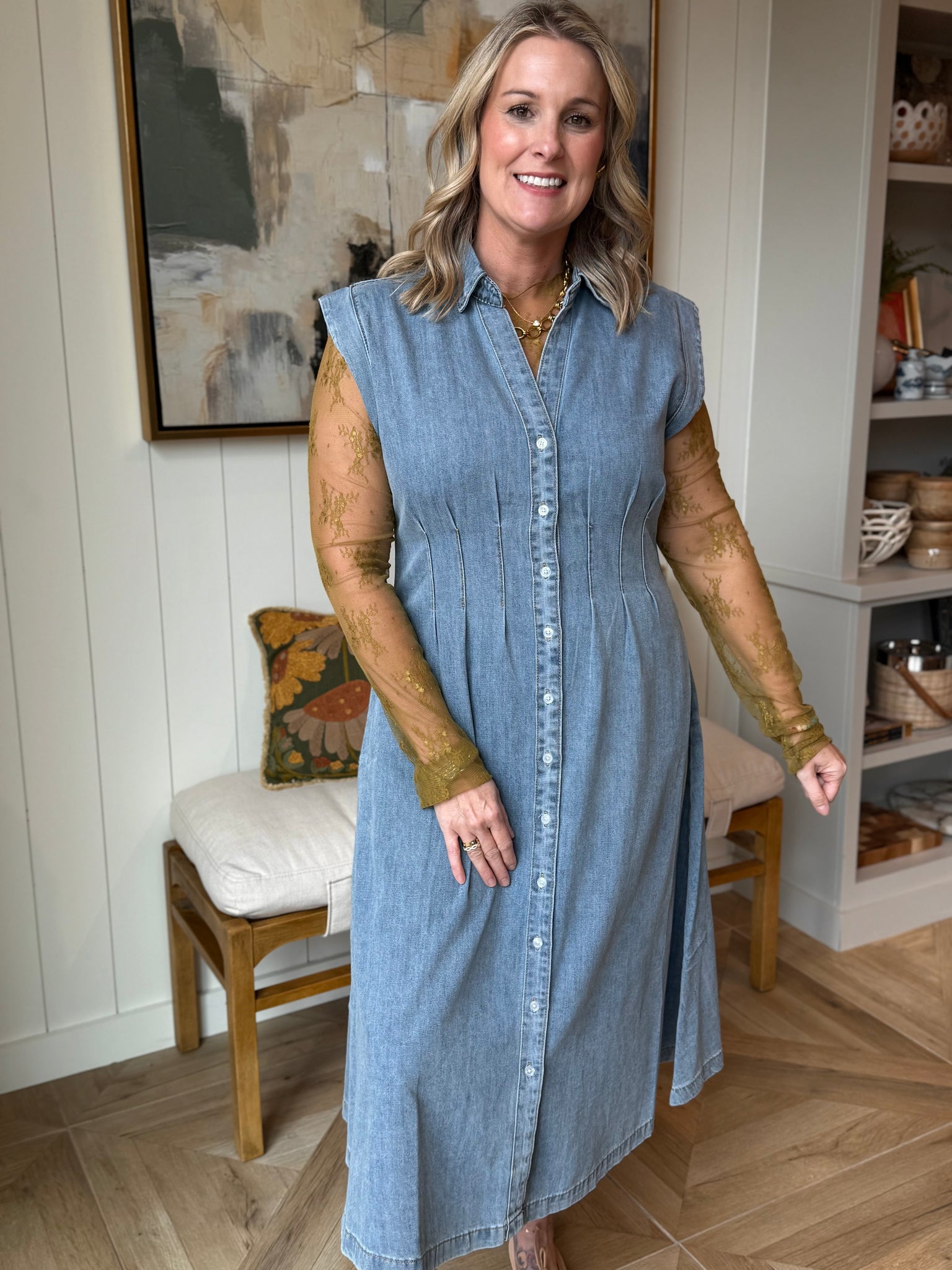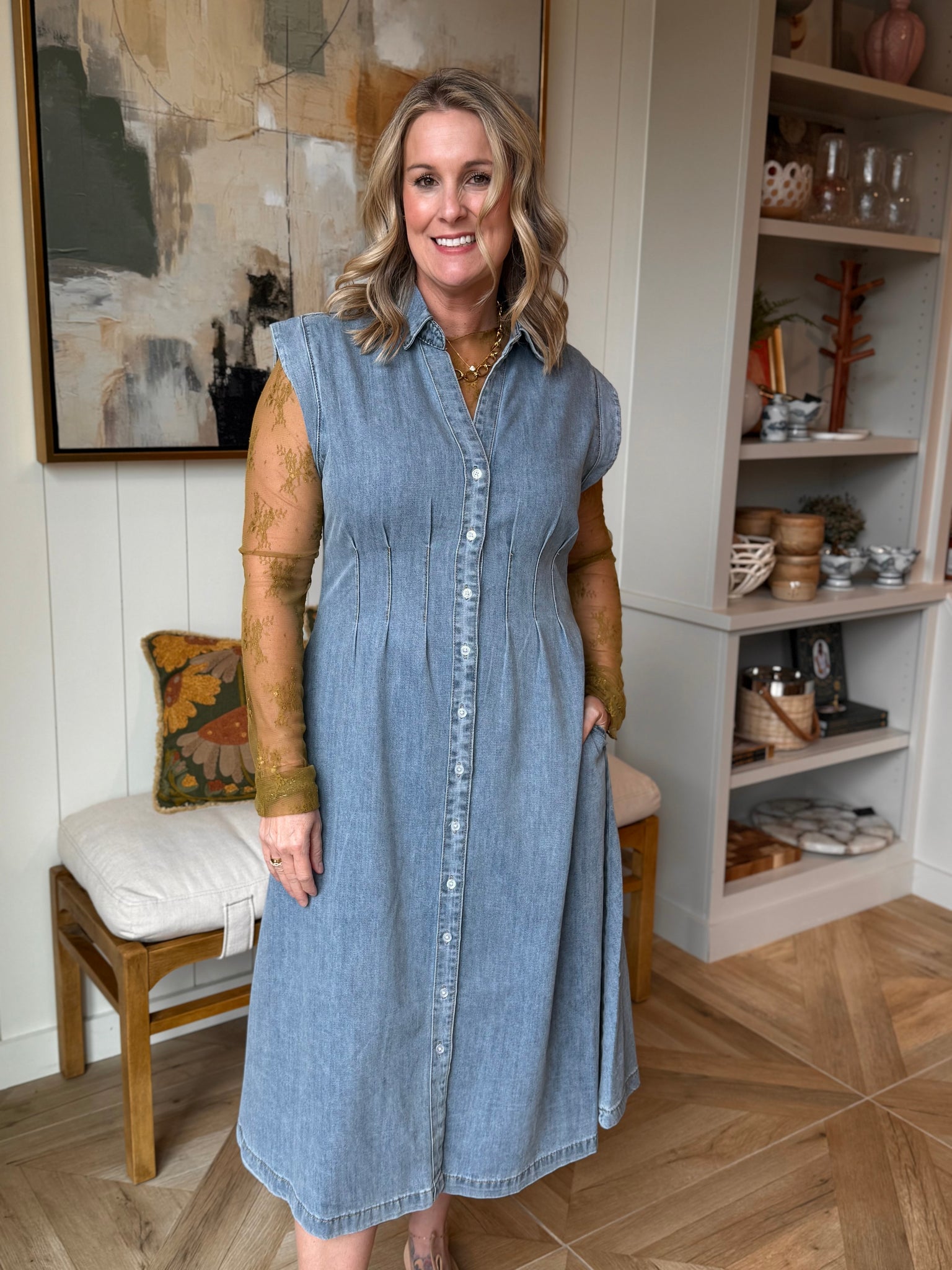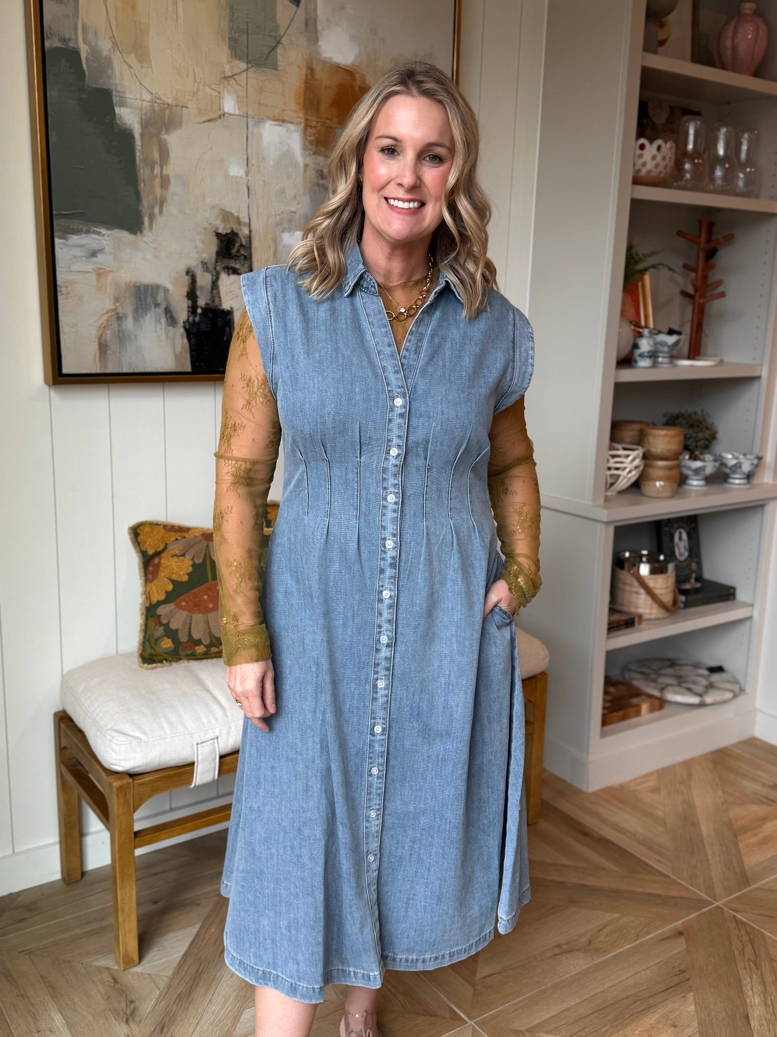 Cap Sleeve Button Up Collared Midi Denim Shirt Dress with V-Neck. Cotton