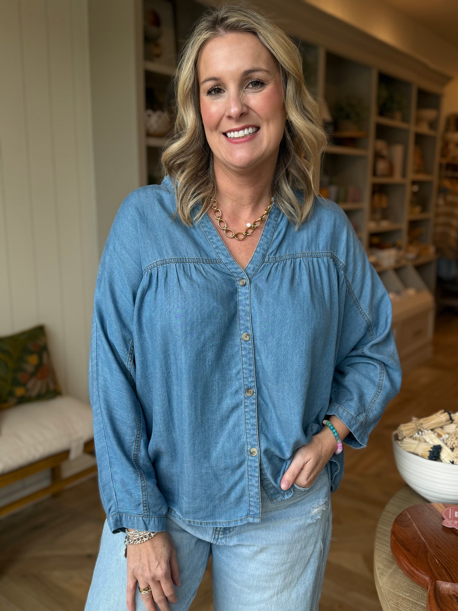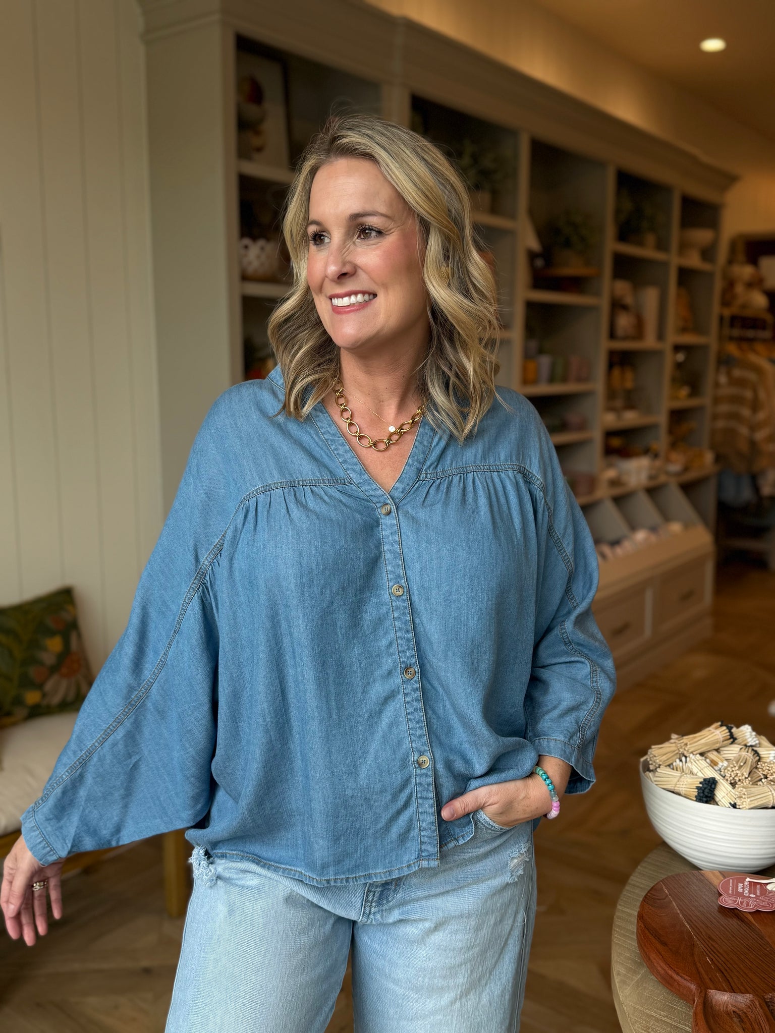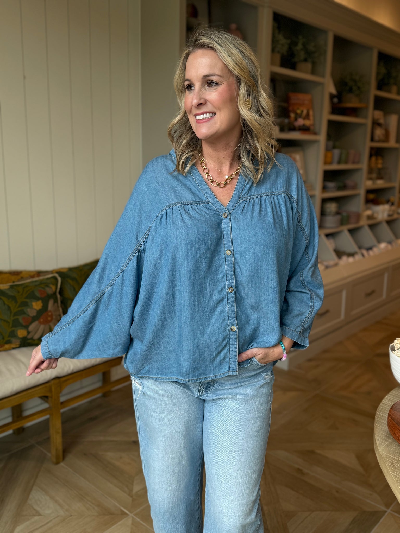 Oversized Chambray Soft Denim V-Neck Button-Up Blouse with Raglan Sleeves  100% Tencel Plus Available