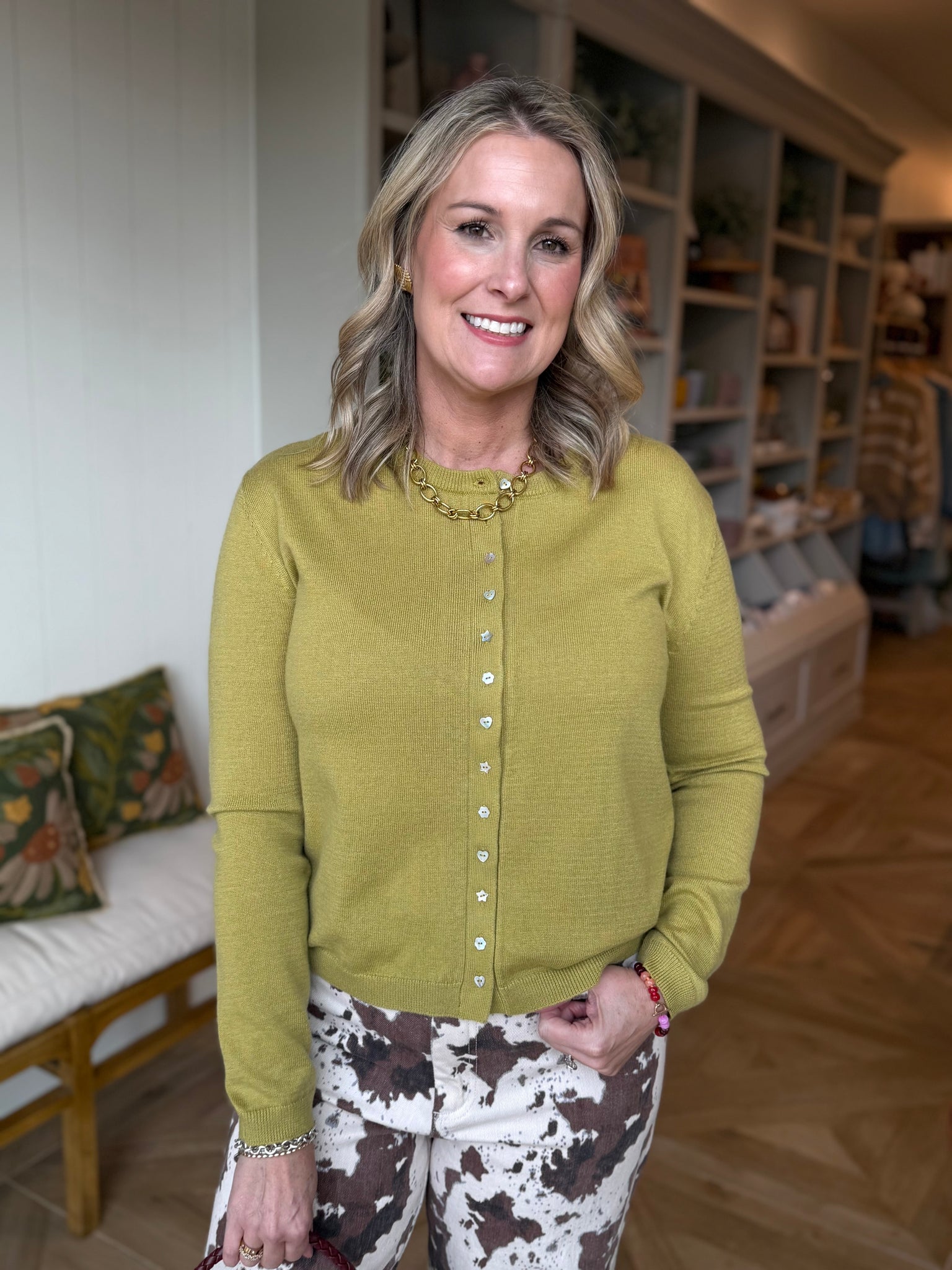 Pistachio Button Down Long Sleeve Slim Cardigan with Various Buttons. 100% Polyester