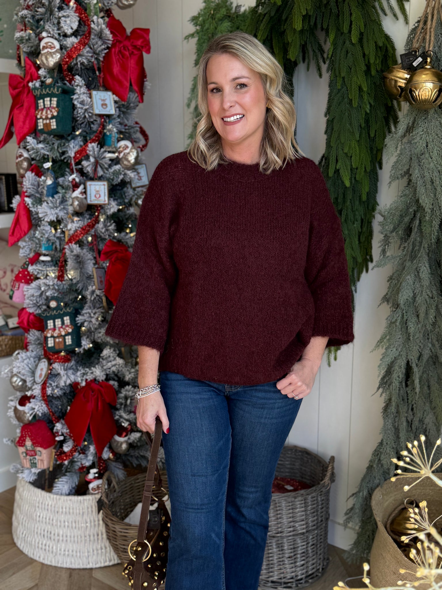 Wine Mock Neck Wide Sleeve Pullover Knit Sweater. Acrylic/Poly/ Mohair/Wool/