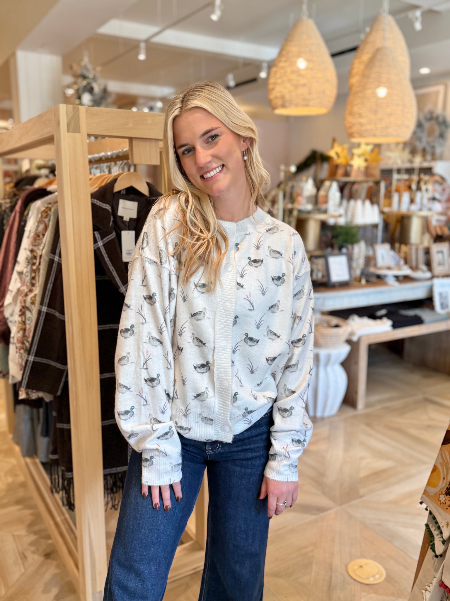 Cream Sweater Cardigan With Ducks. Poly/Nylon/Acrylic/Wool