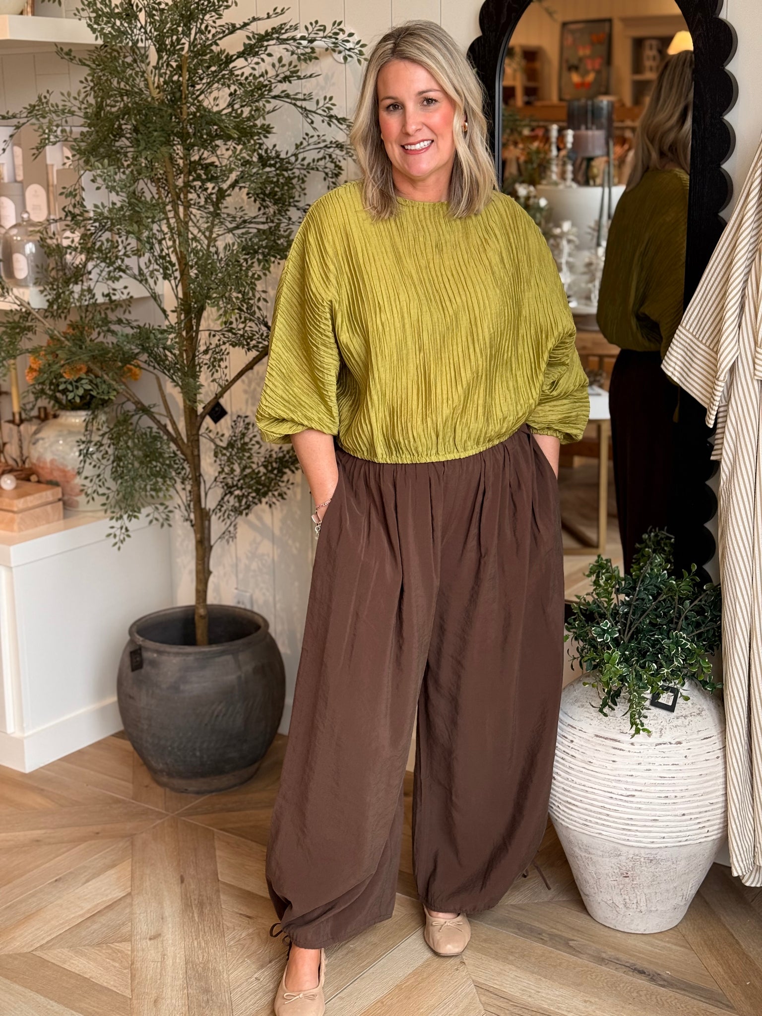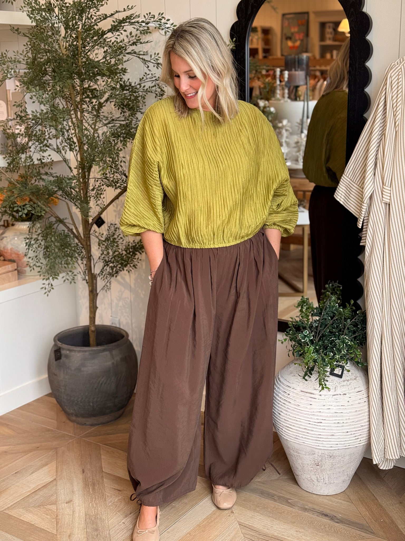 Pleated elastic waist balloon pants with tie ankles.