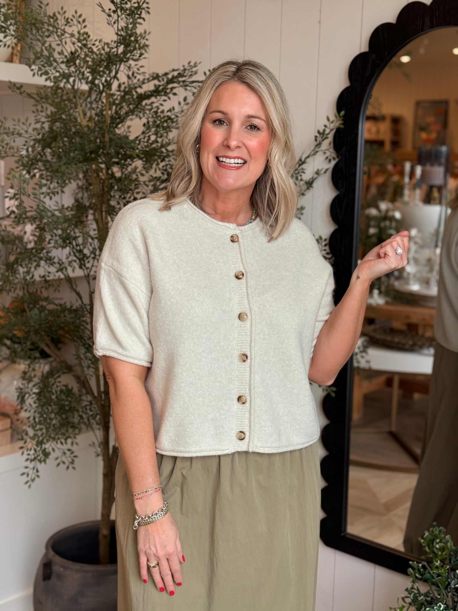 Button up short sleeve cardigan.