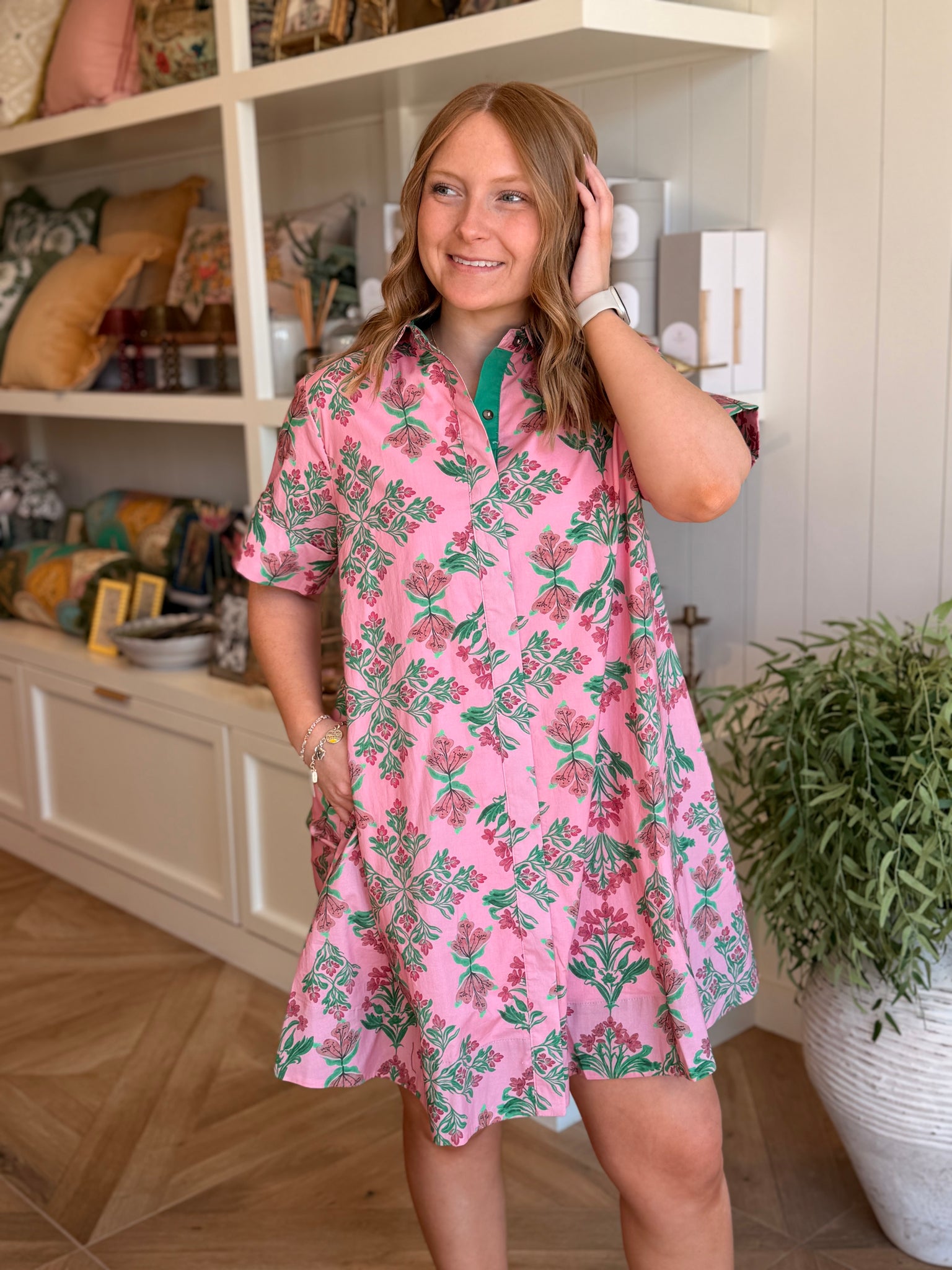 Pink & Green Floral Collared Shirt Dress with Short Sleeves , A-Line and Pleat in Back.