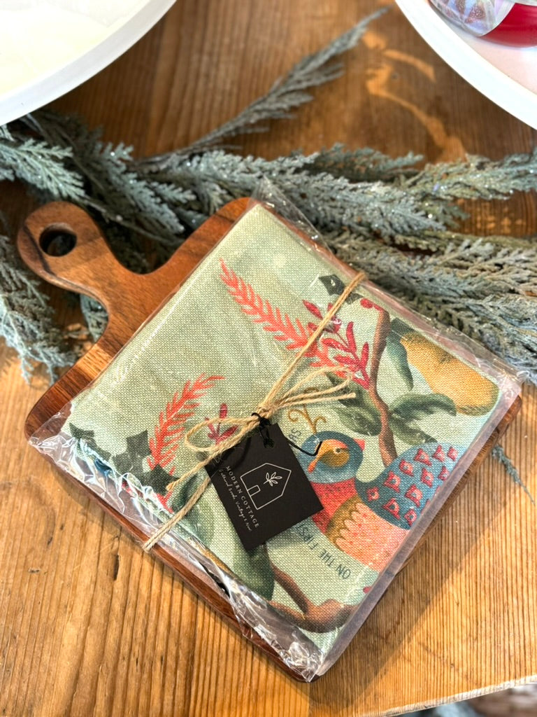 Set of 2 Partridge Pear Tree Tea Towel and Cutting Board with Hanging Handle.