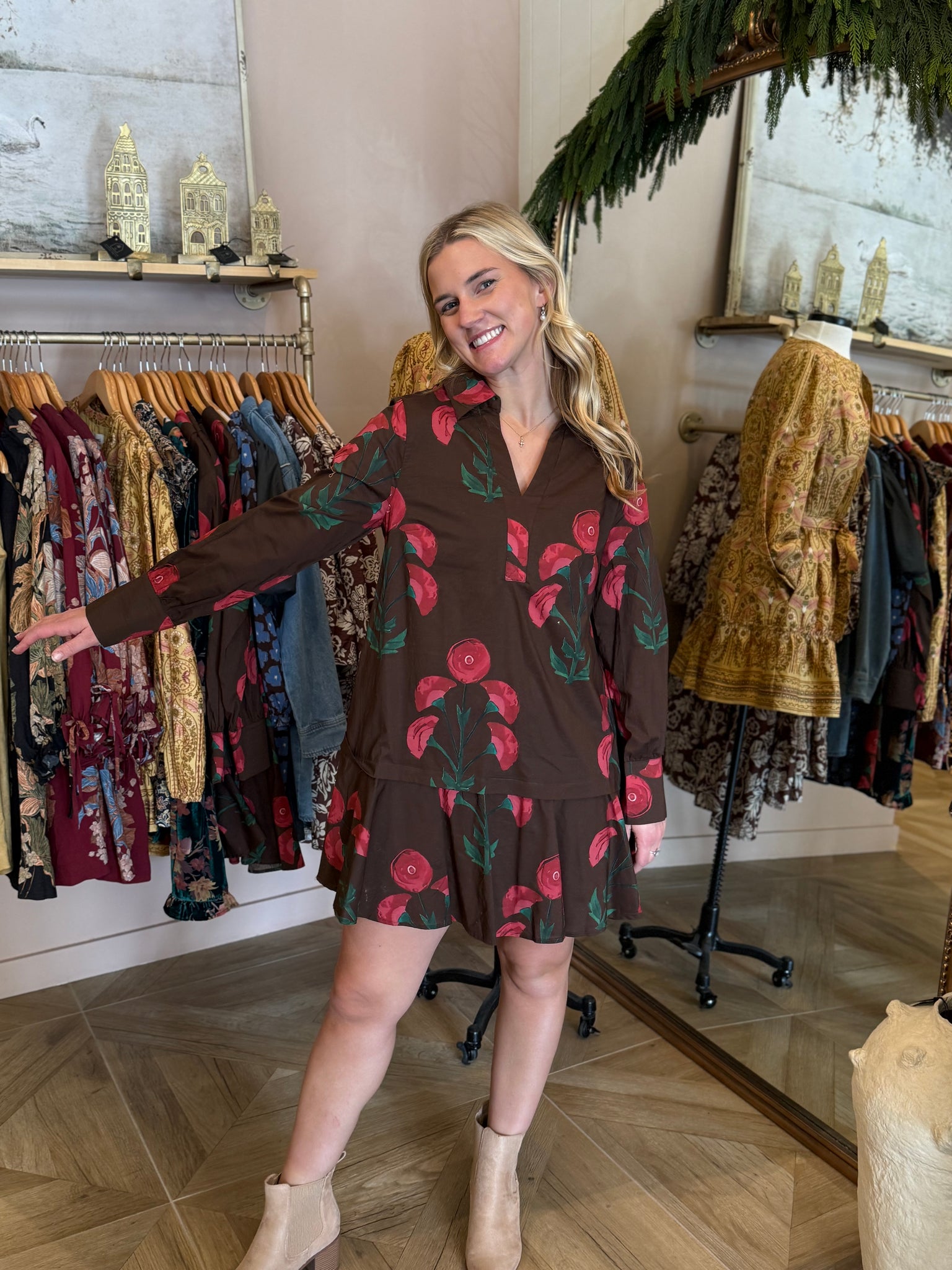 Brown Long Sleeve Drop Waist Dress with dark red flowers, standard collar, and v-neck.